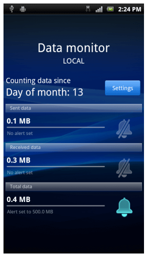 If you have a Sony Ericsson phone, then the manufacturer has you covered with a newly-released app on its Android Market channel. The Sony Ericsson Data Monitor app tracks mobile data consumption in both directions, and gives you the option to set an alert when your usage hits a certain level. If you are on a monthly contract then you can set the counter to reset at the start of your billing period.