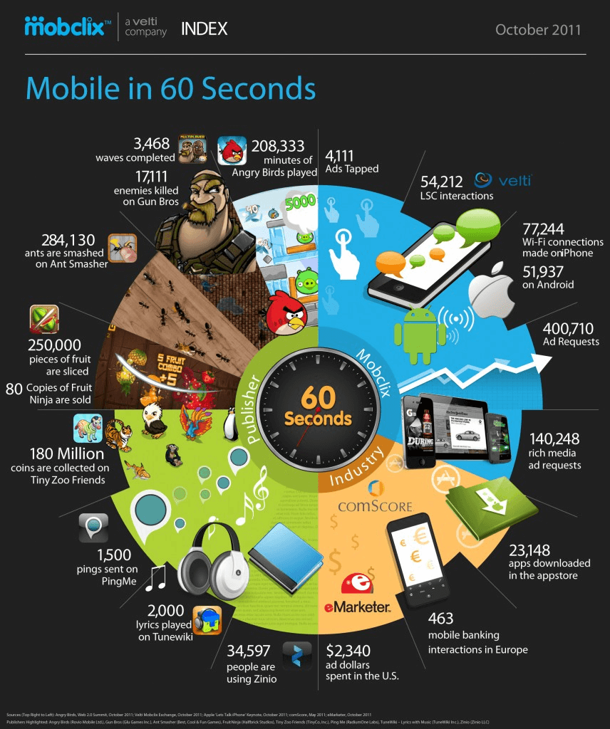 Did you ever wonder what everyone around you is doing with their constantly-out smartphones? Well, Mobclix did some research about what cell phone users are clicking and came up with a snapshot of what goes on in a single minute of usage. Some of the results may surprise you – like 4,111 ads were clicked on. Some may not – like that Angry Birds is simply in a category of usage all by itself. You won’t believe how many people are looking for song lyrics or slicing fruit in Fruit Ninja.