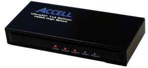 In the past several months as I have been re-working my recording studio I have had the need to utilize some 1×4 HDMI Splitters to replicate HDMI distribution from computers to DVD players. The Accell Ultra Mini 1×4 HDMI A/V Splitter works great especially when you have space constraints. The small footprint of the splitter is significantly smaller than similar splitters from companies like Altona, and you get the space savings without a compromise on performance.