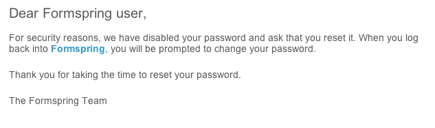 Uh-oh! I ended up having Formspring resend another email, with a new link inside it. That one worked, and I was able to successfully access my Formspring account, and change the password to something completely different than what it was before the security breach. I figured it was worth it to send out this little “heads up” to other people out there who are using Formspring. Hopefully, after reading this, you won’t panic if Formspring sends you an email like the one it sent me.