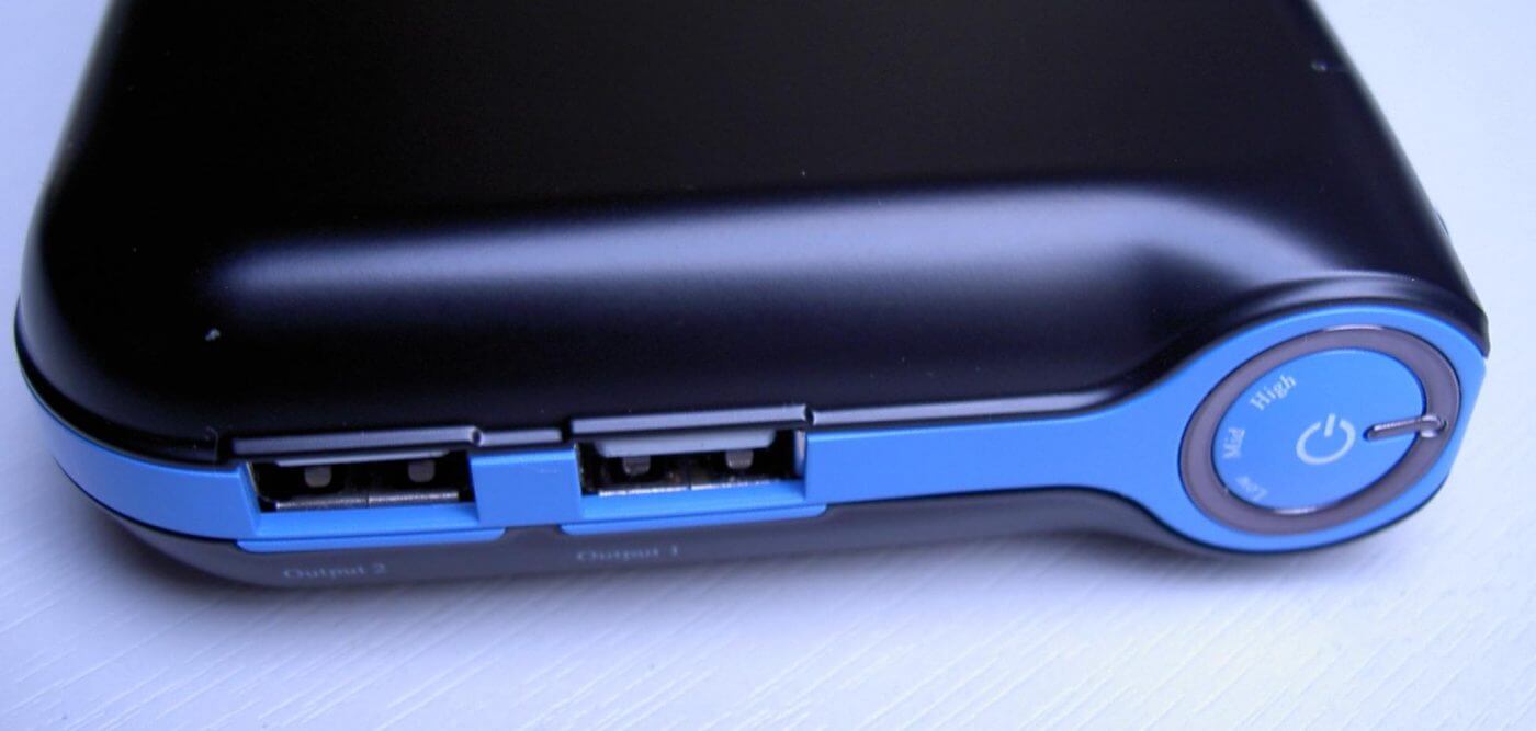 As the pictures show, it’s not unattractive for a battery pack and gets away from the standard rectangular brick. The black plastic enclosure has a blue central band with just four features – an on-off button, a power input socket and two USB ports. The on-off button lights up when charging and a short press of the button briefly shows the iCarrier’s charge level using three blue LEDs for low, medium and high.