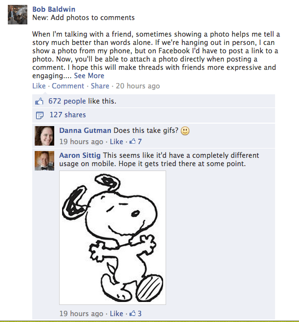 When I’m talking with a friend, sometimes showing a photo helps me tell a story much better than words alone. If we’re hanging out in person, I can show a photo from my phone, but on Facebook I’d have to post a link to a photo. Now, you’ll be able to attach a photo directly when posting a comment. I hope this will make threads with friends more expressive and engaging.